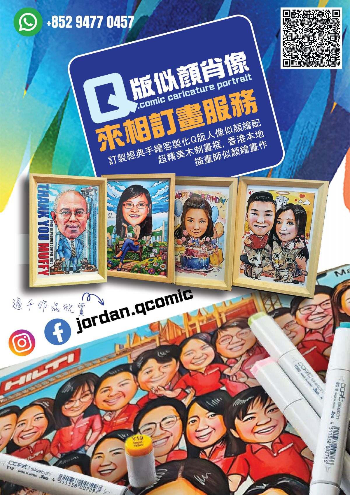 [預購] 香港製造Q版人像訂造似顏繪原木手工製人像畫連相架,香港本地插畫師Q版似顏繪畫作,背景可以加入香港本地不同原素及題材,似顏繪家庭畫作,適合全家福、婚禮照片、寶寶照片等重要場合。