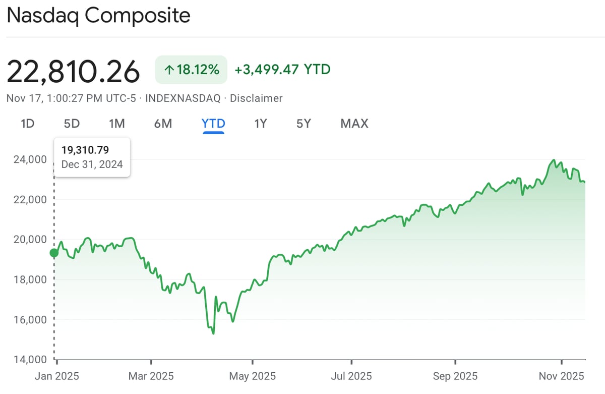 美國科技股過去一年表現驚人,美國納斯達克綜合指數由年初的 19,310 點升至 23,000 點,全年升幅達 19%。但真正引人注目的,是 AI 相關公司的爆炸性增長: