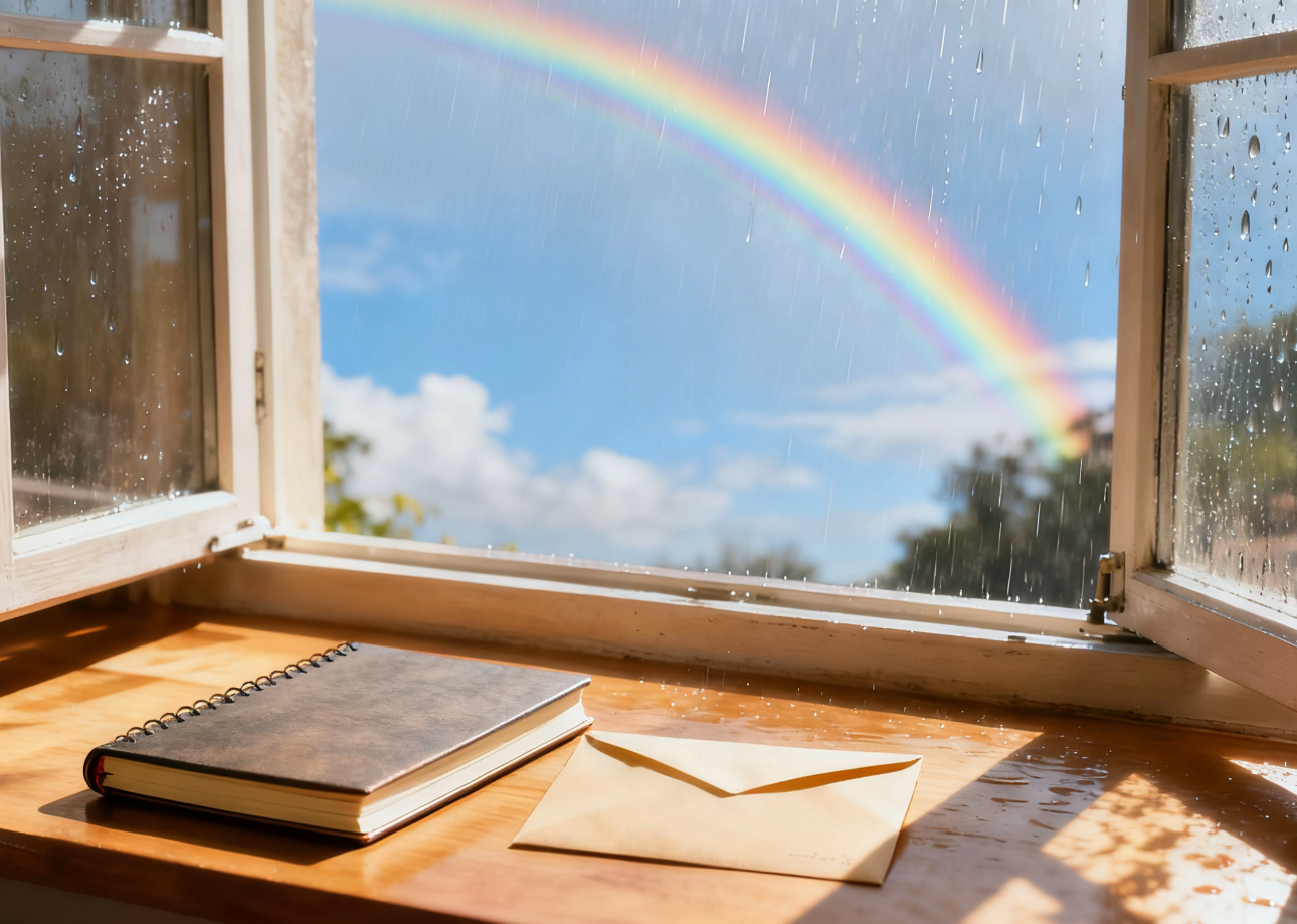 最後,我想通了。我看着逐漸放晴的天空,感受到前所未有的放鬆,樹葉滴下殘留於其上的雨點,把我臉上的糟糕洗滌乾淨,展現了一絲笑容。