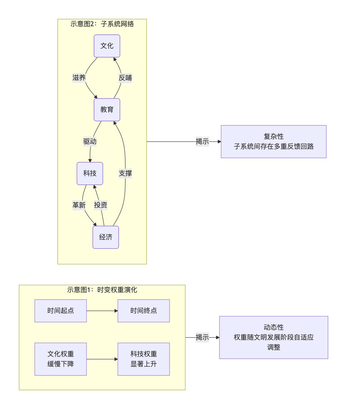 该大模型提供了完整的数学框架,能够捕捉文明发展的动态本质,权重随时间自适应调整,各子系统相互影响,可用于模拟不同文明发展路径、预测未来趋势或分析历史演变机制。