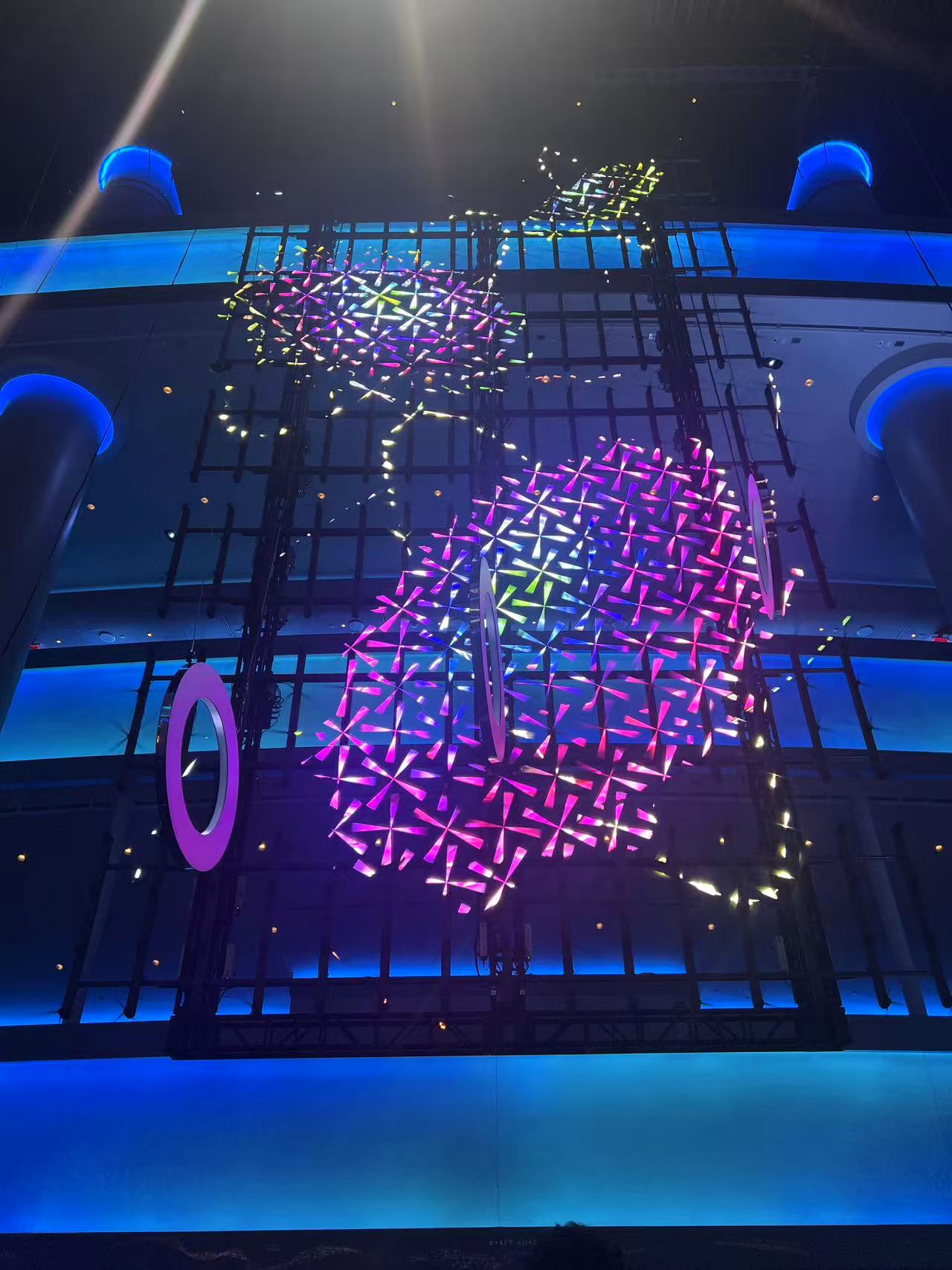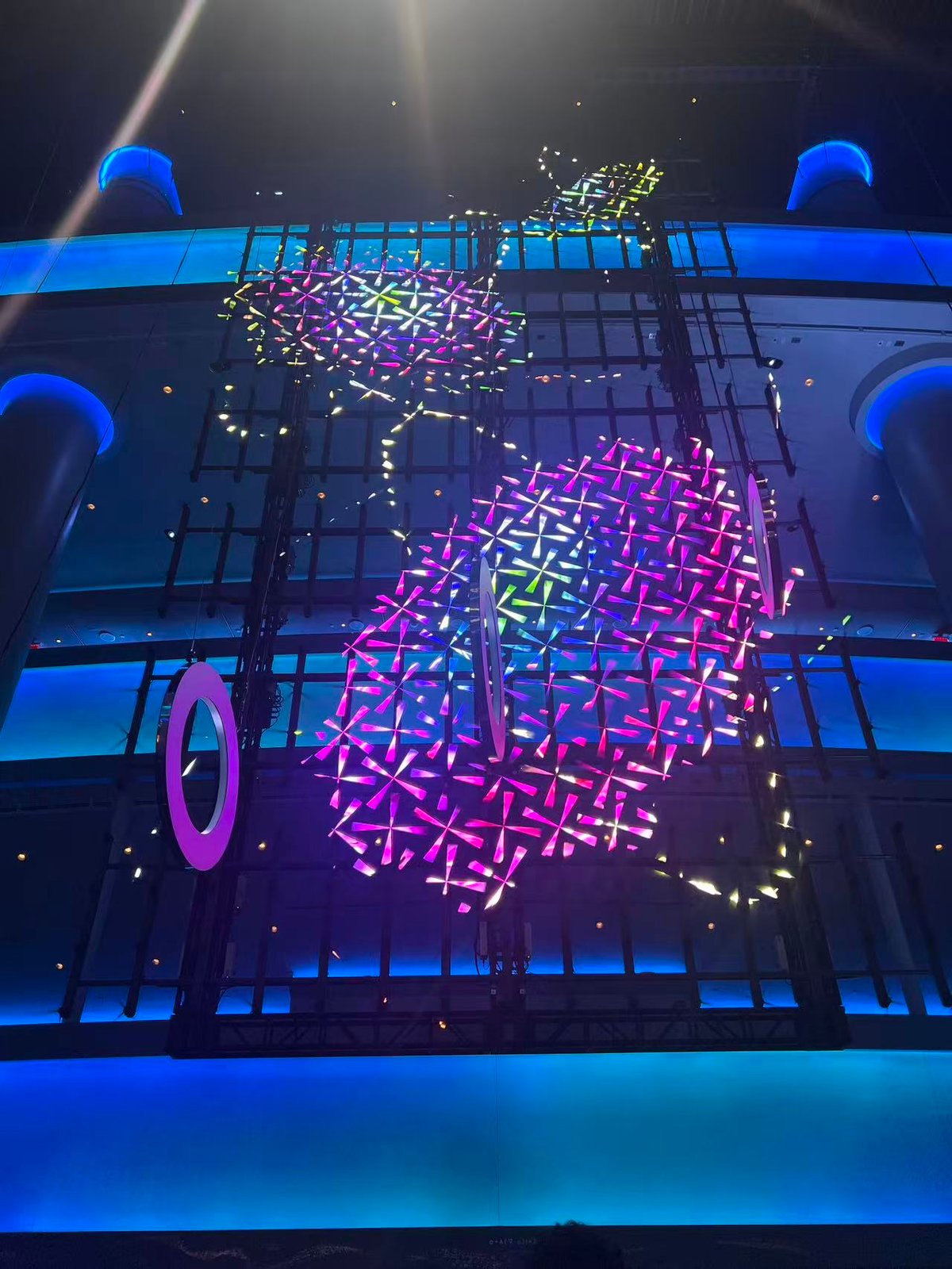 接下來的表演才是真正的高潮。當燈光暗下,Sphere的內部投影系統開始運作時,我立刻被眼前的景象震撼到。360度的高精度投影包裹著整個球體內部,從天花板到地面,整個空間變成了一個動態的視覺世界。圖像、光影、音效和震撼的低頻振動交織在一起,給人一種全身心被包圍的感覺。