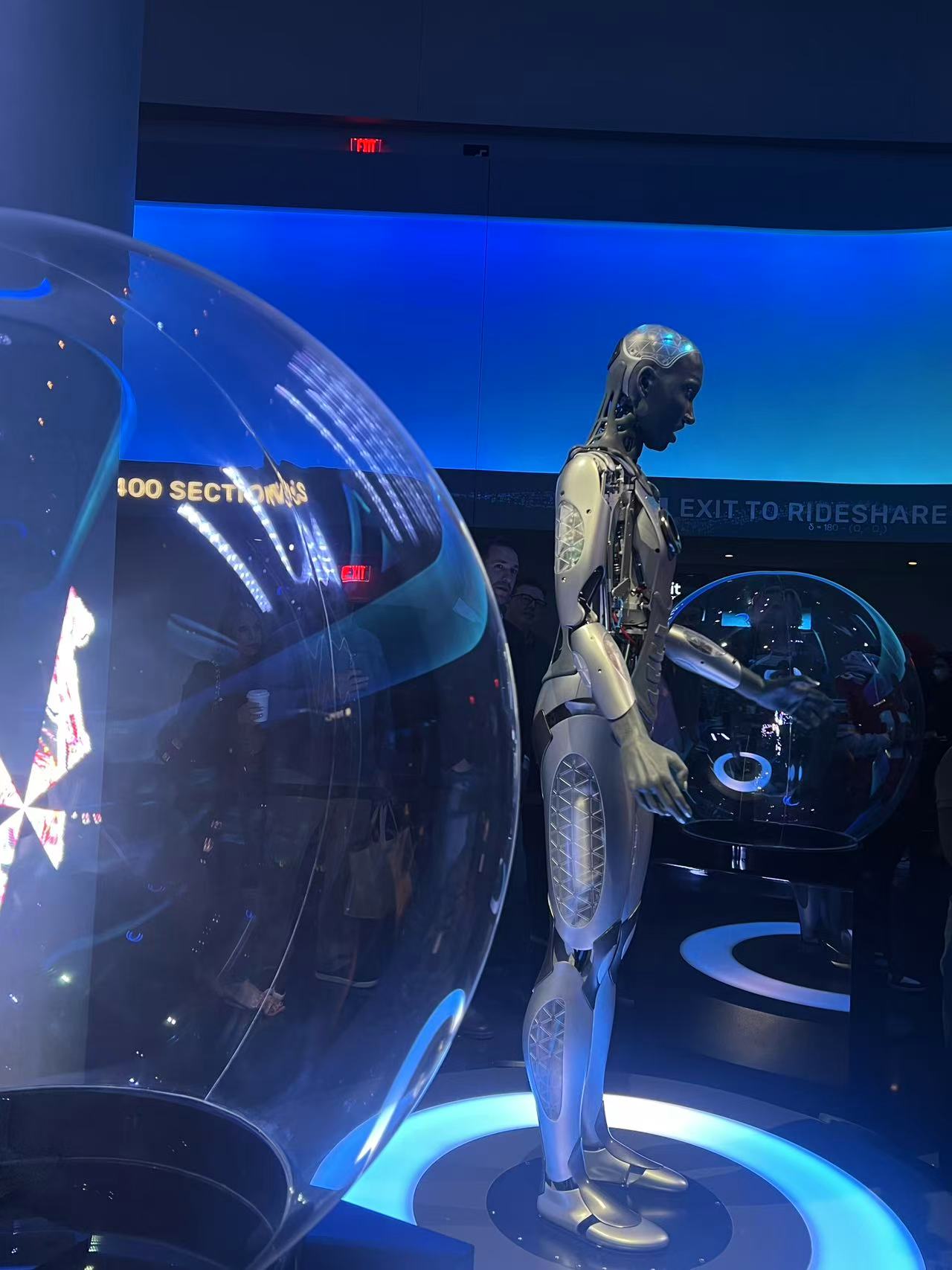 在正式表演開始之前,我還有機會與人型機器人互動,這是我第一次親眼看到可以與人交流的機器人。它不僅能跟我對話,還能模擬表情和手勢,甚至根據我的動作作出反應。我嘗試與它互動,它會根據語音提示作出不同動作,有時還會小小地「調皮」一下,逗得我忍不住笑出聲。這種近距離互動讓我完全沉浸其中,感覺彷彿走進了未來世界。