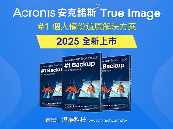 慶祝 Acronis True Image 2025 正式上市,即日起至 12 月 31 日 止,總代理湛揚科技官方授權商城【享購物https://www.enjoyshop.com.tw 】獨家開賣,新品上市優惠1299起,讓消費者能以優惠價格,輕鬆升級可靠安全的資料備份與防勒索解決方案。如需企業客戶或合作夥伴的備份及網路安全防護解決方案資訊,請參考Acronis總代理湛揚科技官網 www.t-tech.com.tw