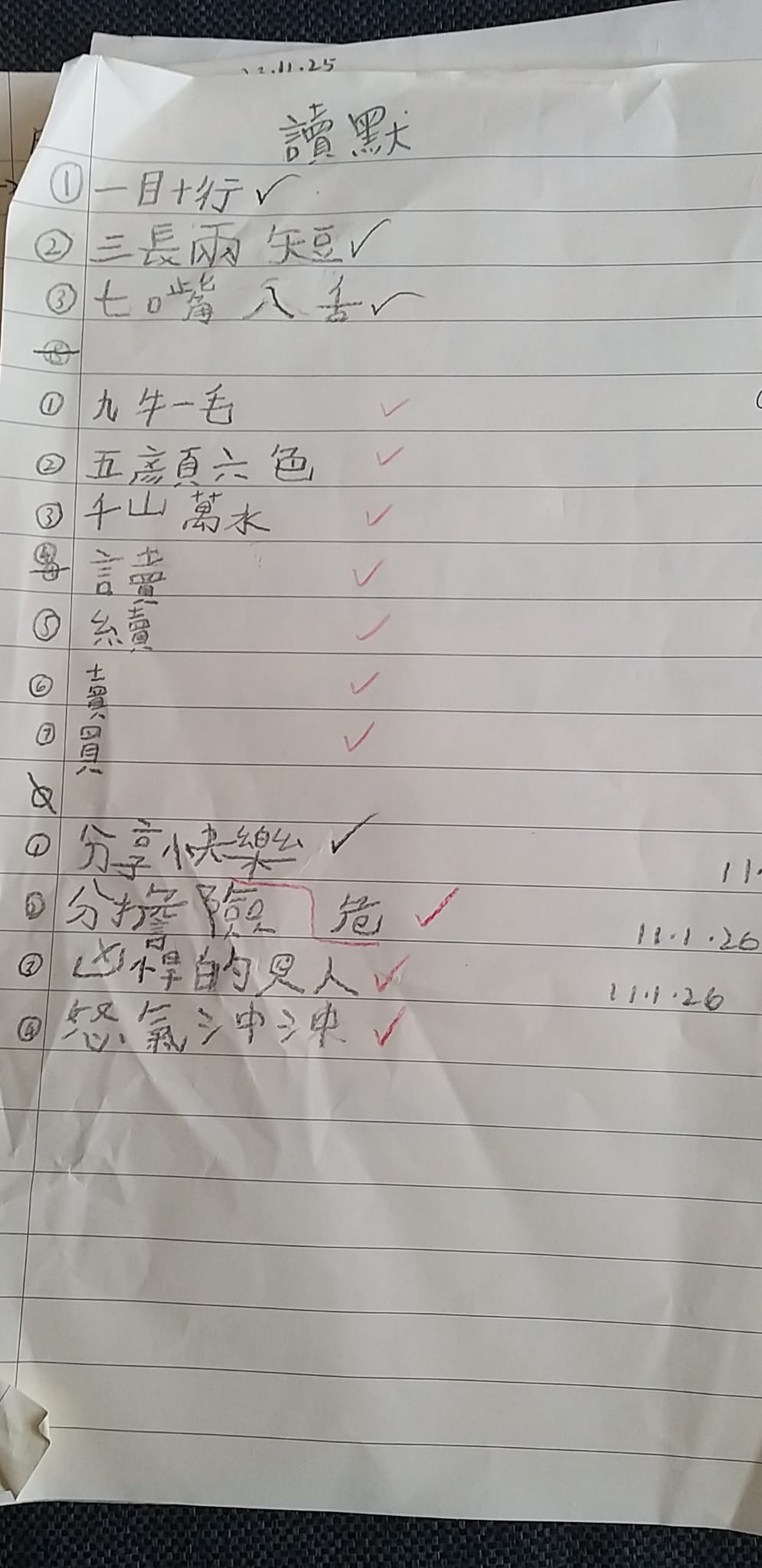 前陣子,她不再想抄寫文章,她想默寫。剛開始是默生詞,後來就默整篇文章,所謂整篇文章,字數都不會很多的,我又讓她默。當然,除了默書之外,每天我都會教她不同的語文知識,又和她一起進行不同的學習活動,每天都會默一些詞語。