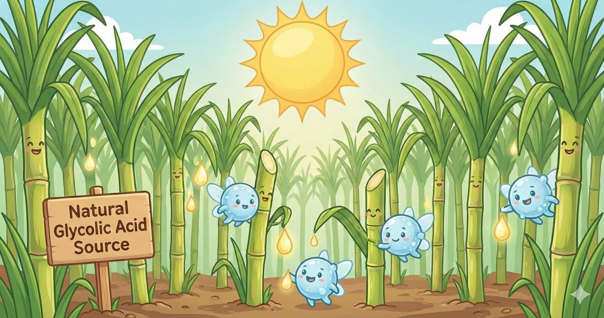 天然來源 🌱: 甘醇酸主要存在於 甘蔗 (Sugar Cane) 之中,是一種天然植物性酸。