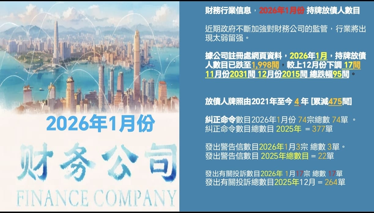2026年1月持牌放債人數目僅剩1,998間,較2025年12月(2015間)減少17間,較11月(2031間)累計減少95間;若以2021年為起點,4年間持牌機構已「驟減475間」。這一數據直接體現監管層「強化合規門檻」的效果——不合規、抗風險能力弱的小型機構陸續退出,行業集中度將進一步提升。