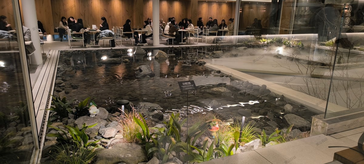 ☕釜山西面區域的潮流咖啡廳La Soop(地址:釜山鎮區東城路Dongseong-ro)。咖啡廳共有三層樓,設計結合了室內與戶外空間。室內設有大型階梯式座位,而最引人注目的是其戶外水池造景,在特定時間會噴灑煙霧,營造出夢幻迷離的氛圍,被許多遊客形容為「浮誇」且極具「仙氣」的打卡聖地。提供各類烘焙麵包、飲品及精緻甜點,例如季節限定的莓果起司蛋糕和巧克力費南雪。這家店從早營業到晚,夜晚在燈光和煙霧的襯托下更顯浪漫,是當地非常受歡迎的城市療癒空間。