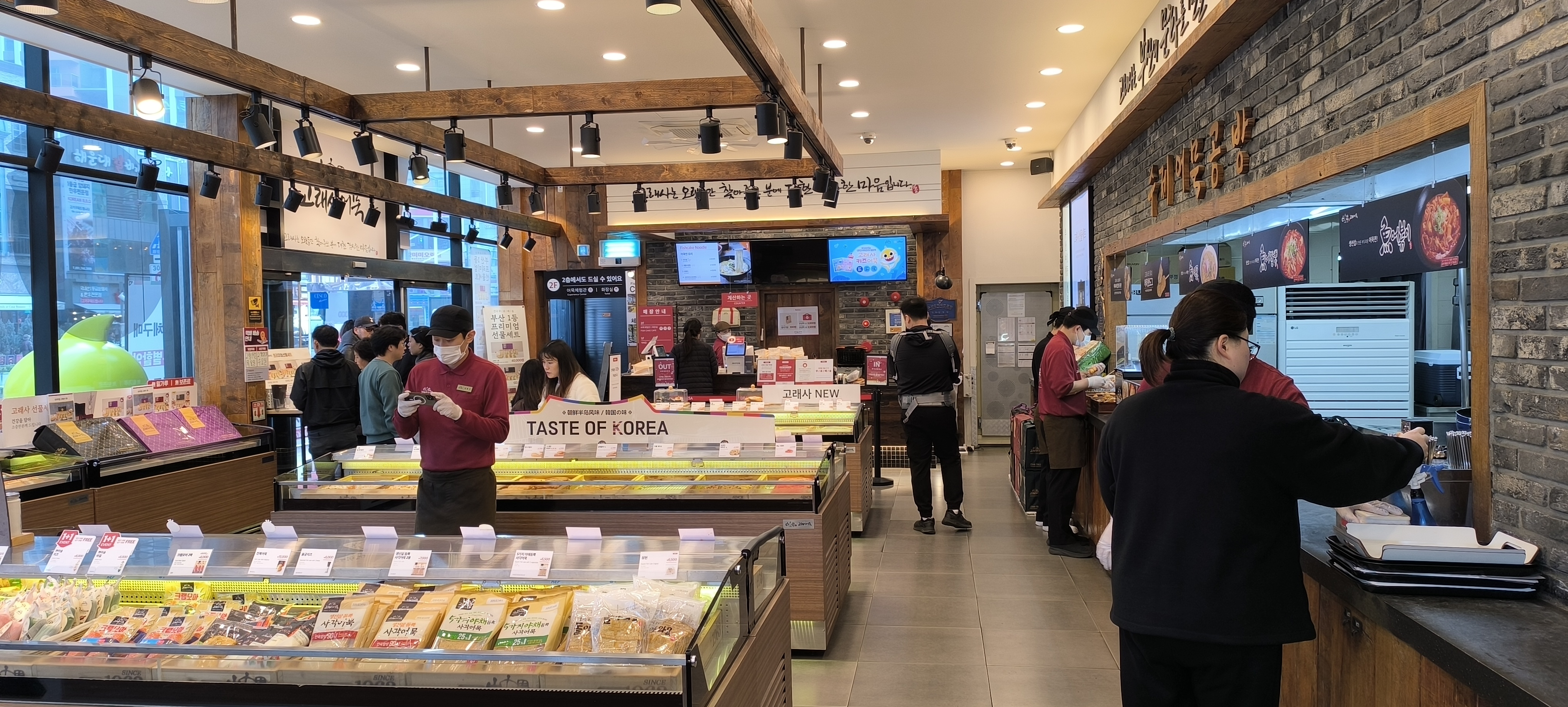 🦞這家魚餅店就在Grunam-ro上,店外有大摞的外賣包裝盒以及卡通魚的廣告裝飾,正門上方是一塊匾,黑色的上有白色的店名:一個漢字魚連著朝鮮文字。店內開闊,區間分明。開門是收銀和外賣包裝。大廳裡排開傾斜檯架,有種類繁多煎炸好的魚餅魚糕。正面那個櫃檯是加工區,可以即場加熱所選而且付過費用的魚餅魚糕,旁有筷子湯羹之類的餐具。店舖的深處劃分出一塊小區域,有幾張檯桌和座椅,靠牆是吧台式的單人座位,在用餐間的外圍,是魚湯鍋以及回收餐具處。魚湯很熱,喝起來有滿口的魚香味,寒冷的冬天裡非常受歡迎。魚餅店很熱鬧,他們一早過來的。早餐吃魚餅喝熱魚湯,是第一次,他們在靠牆的座位坐下來,用餐間都是朝鮮人,顯然,遊客不習慣一大早吃魚餅的。喝著熱湯,他說,想起多年前在明洞吃的平壤冷麵,那會他也是很喜歡喝那個熱牛肉湯。
