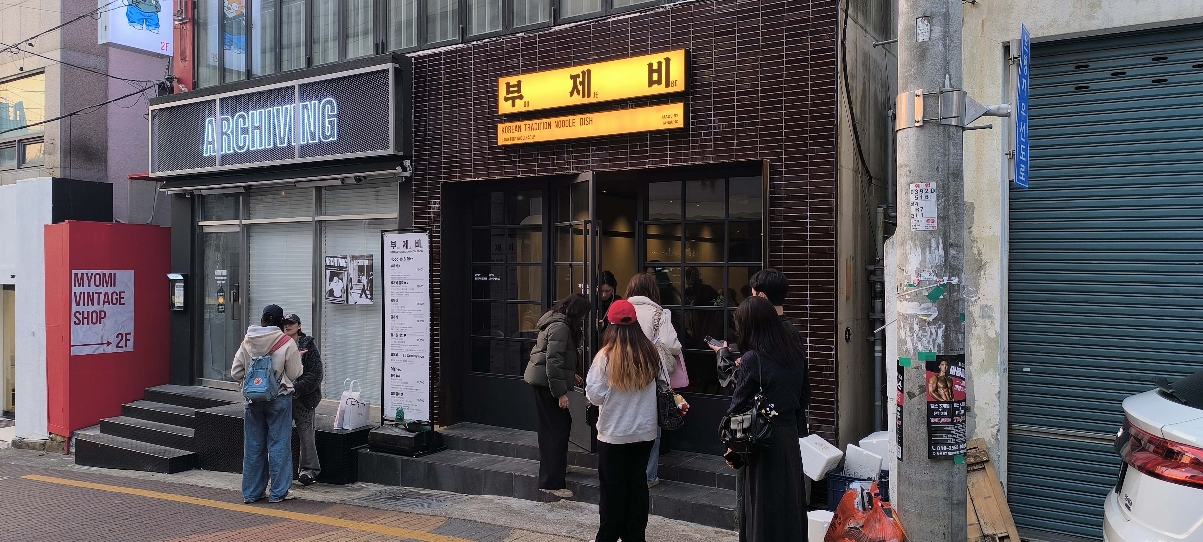 他們早早來到Bujebi (地址:Busan, Busanjin District, Seojeon-ro 38beon-gil, 43-3 1층),舖頭已滿座,唯有在外面等候。原來這家Bujebi 除了麵疙瘩、刀削麵還有烤鴨肉烤豬肉等,網評也可以的。他們是點了不同的麵疙瘩,伴菜也不一樣。鄰桌是一對情侶,應該是本地人。那位漂亮的女伴一身瑜珈窄身打扮,也許是做完運動回來,那麼冷的天這身穿著略顯單薄。靚女老往他們這邊看,後來還是忍不住了,主動探頭過來說:這個伴菜點這個調料吃那個伴菜要加入湯麵吃。他們趕忙說著謝謝、謝謝,然後尷尬得不知如何。