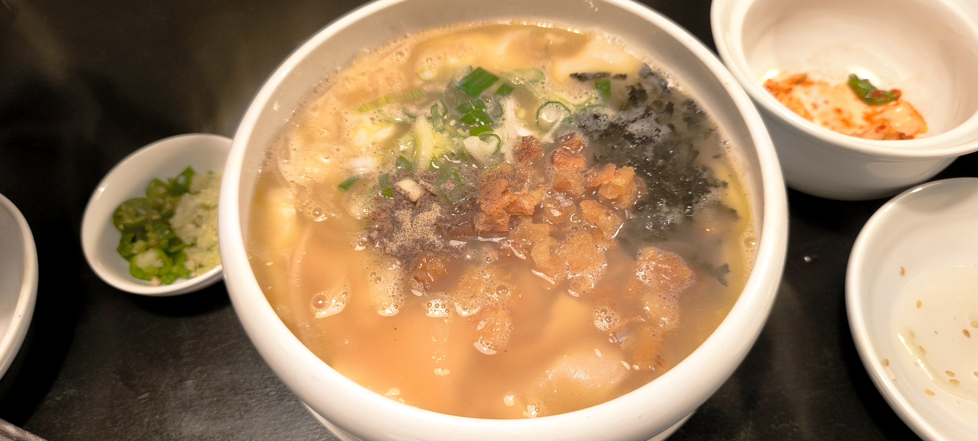 要說比較好吃的,還是三清洞麵疙瘩專賣店(地址:首爾特別市鐘路區三清路101-1),麵疙瘩是用手撕開麵糰後,放入鯷魚高湯中煮熟的料理。店家主打麵疙瘩,加入櫛瓜、蛤蜊肉與馬鈴薯滾煮後,裝入罈子裡上桌。湯熱味香麵有新鮮製作的咬口。