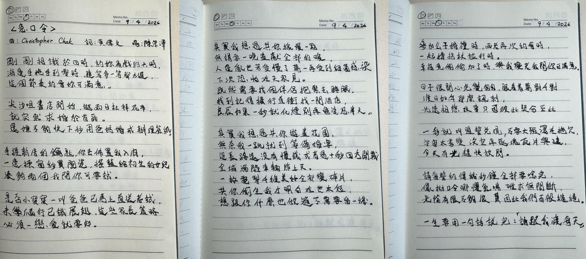 不過,自從串流音樂取代了CD,成為主要的音樂媒體後,閱讀和抄寫歌詞的習慣亦逐漸消失。偶爾遇到動人的歌曲,也會多聽幾遍,但歌詞內容總是水過鴨背,很快便會忘掉,彷彿浪費了填詞人的心血。