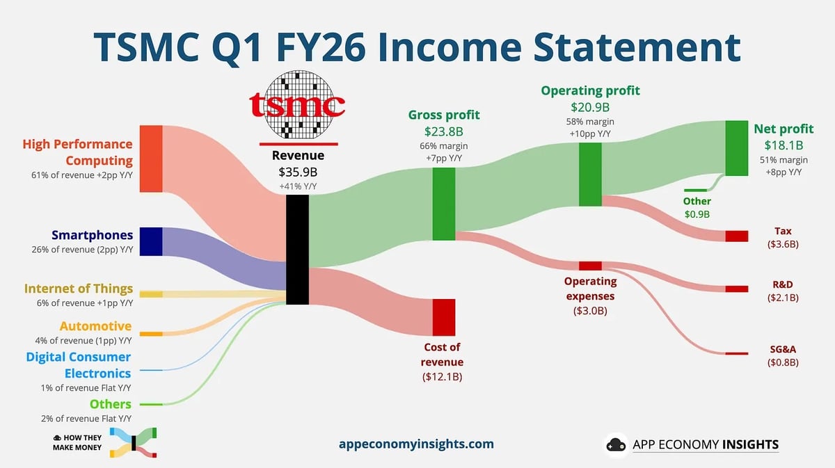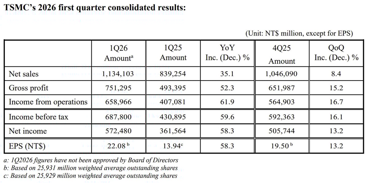 上星期,台積電(TSM )公佈2026年第一季業績,整體表現可謂「強勁且符合預期」。公司季度營收再創新高,淨利按年增長58.3%,毛利率達66.2%,營收高達359億美元,全面超越管理層預期區間上限。這份成績單不僅反映晶片短期需求強勁,更再次驗證其長期競爭優勢。