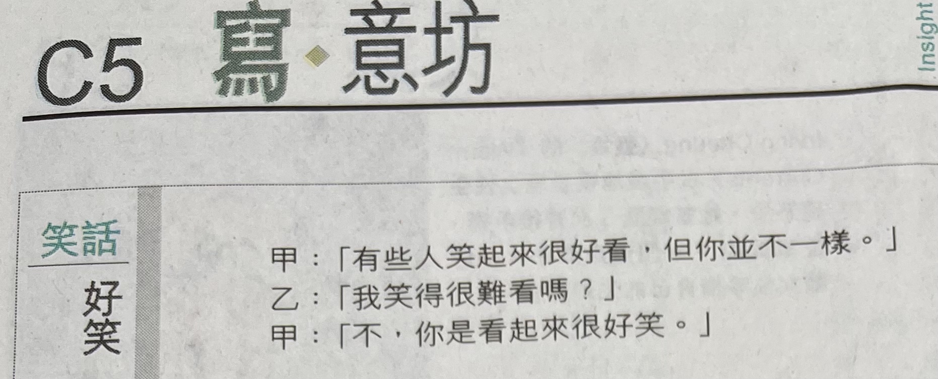 甲:「有些人笑起来很好看,但你并不一様。」