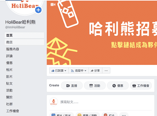 你應該要根據你的企業、品牌的需求來設計符合你的頁籤,譬如說,不是所有的品牌都會有「商店」這個頁籤,你可以將不需要的頁籤移除來保持頁面的乾淨以及關聯性。為了方便,臉書有幾個預設的模板給商家套用,比如說上圖的哈利熊,就是套用了「服務業」的模板,其他可以套用的模板包括: