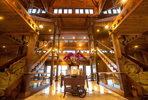 林會館擁有「亞洲第一大木屋」之美譽,整棟建築以檜木打造,獨樹一格。一走進飯店大門,便能聞到淡淡檜木香,搭配典雅的裝潢,令人印象深刻。房內擺設精緻,打開窗,便可一覽日月潭美景。其中湖景房中有「垂釣客房」,房客只要一走到陽台,便能近距離欣賞湖面風光,甚至可以直接在房間內體驗釣魚樂趣,渡過悠閒的午後時光。如果現場釣到魚,飯店還會提供烹調服務,讓您能立即享用新鮮美味的魚料理。但是此種客房只有八間,想要體驗的人要事先預訂喔。