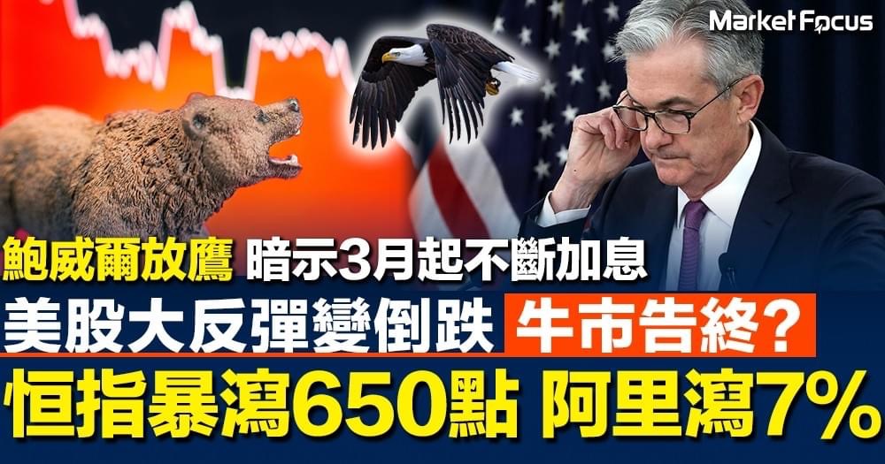 聯儲局公佈利率決議之後,三大指數即由高位固落,主席鮑威爾發言時強化鷹派立場,暗示三月起會首次加息,又預計進入加息後開始縮表。