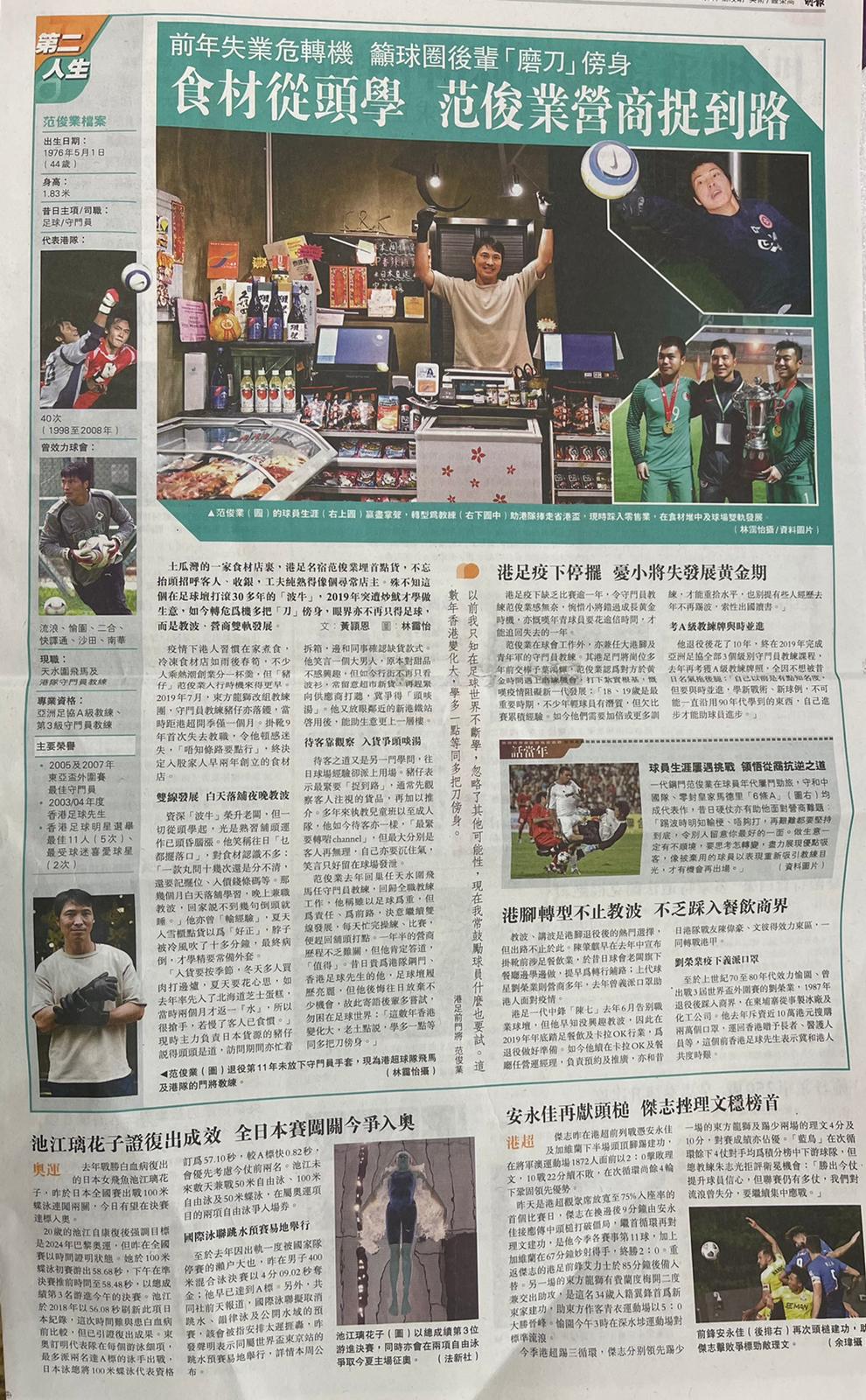 如圖中的范球員在疫下足球停擺,放下身段,轉開「雜貨店」,由開舖、執貨、編碼、招乎客人、賣野等等,全都是親力親為,自己一腳踢,仍是「波牛」上身沒有停下,這就是「獅子山精神」。
