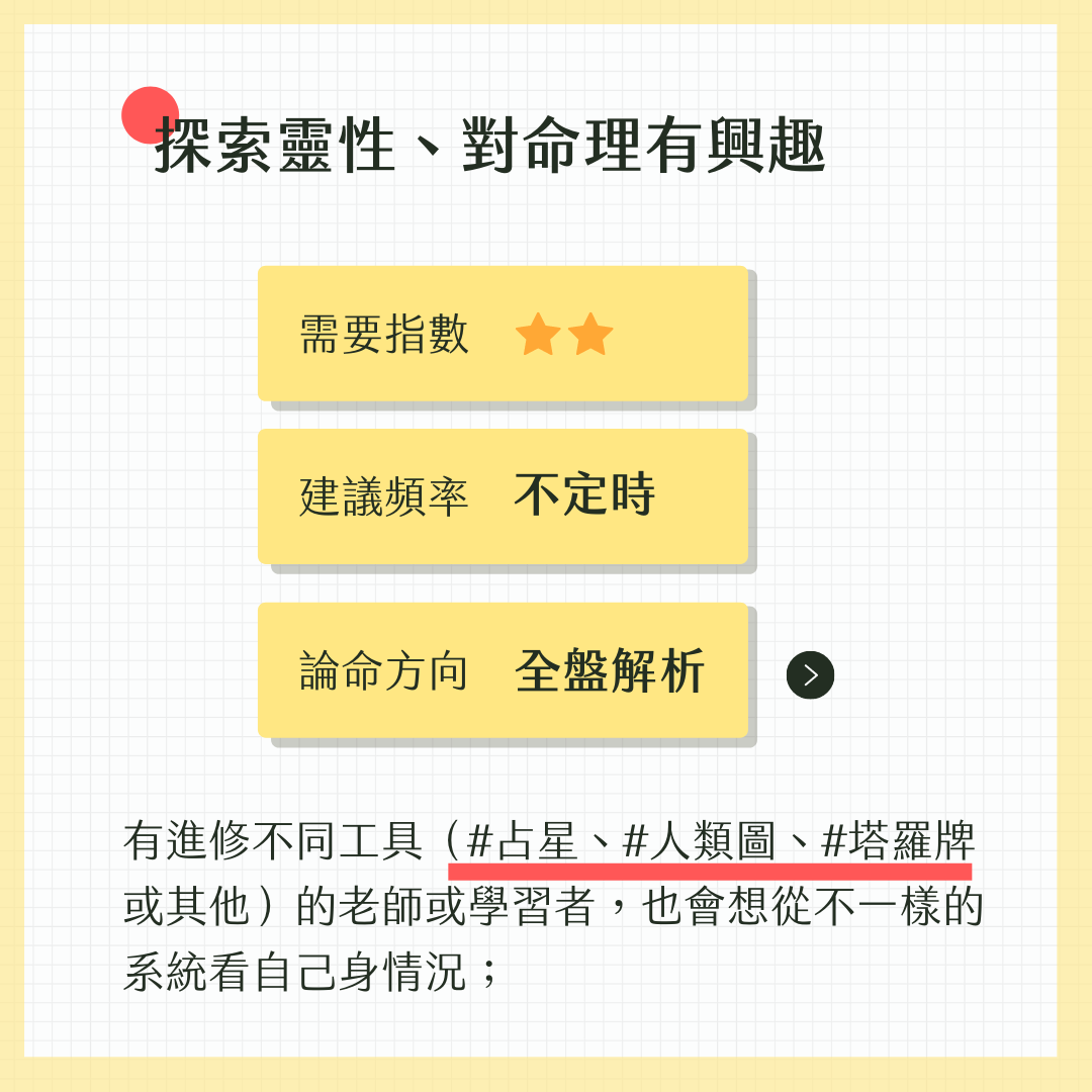 5|探索靈性、 #內觀:想了解個人特質、靈性領域的觀點及價值,屬於一次性的解盤