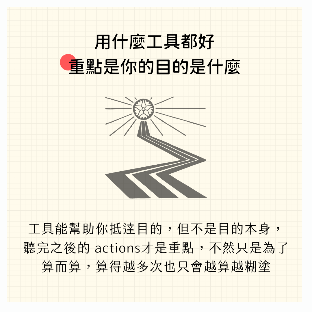 ▌不論哪一種、用什麼工具都好,你要很清楚自己的目的是什麼;聽完之後的 actions 才是重點,不然你算得越多次、用一堆的工具只會越算越糊塗