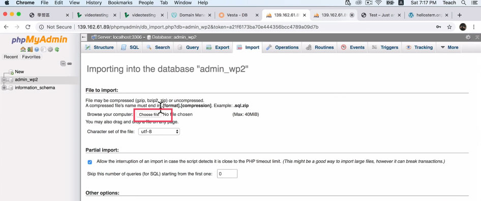 我們打開phpMyAdmin,並進入我們新SERVER的資料庫。進入資料庫後,我們可以匯入(import)剛才我們的.sql file。