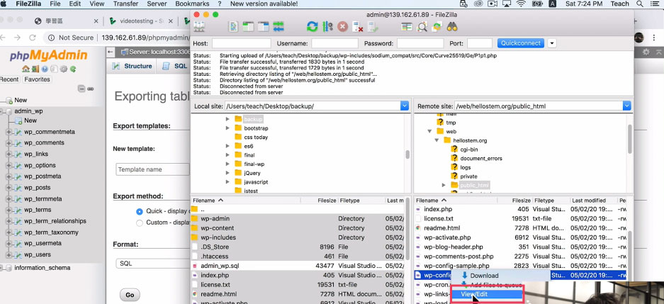 我們點擊wp-config.php這個file,選擇編輯(edit),並把裡面的database的資料更新到你新SERVER的DATABASE資料。
