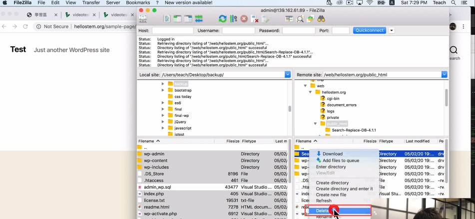 如果還擔心自己尚未刪除search replace DB檔案的話,我們可回到FTP,作最後的檢查。把整個Folder刪掉。