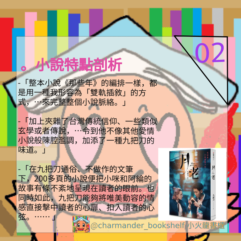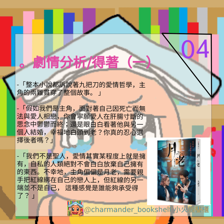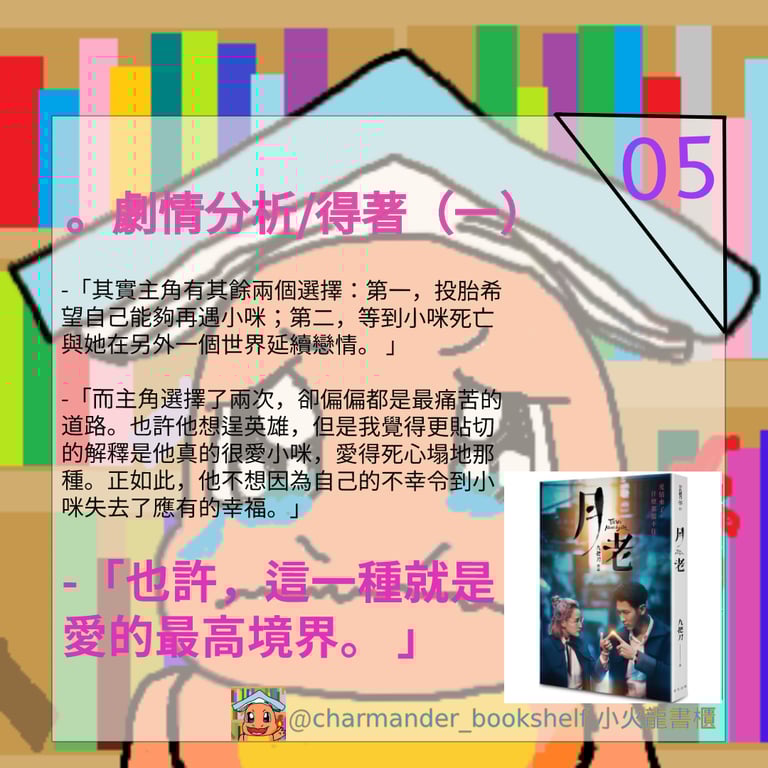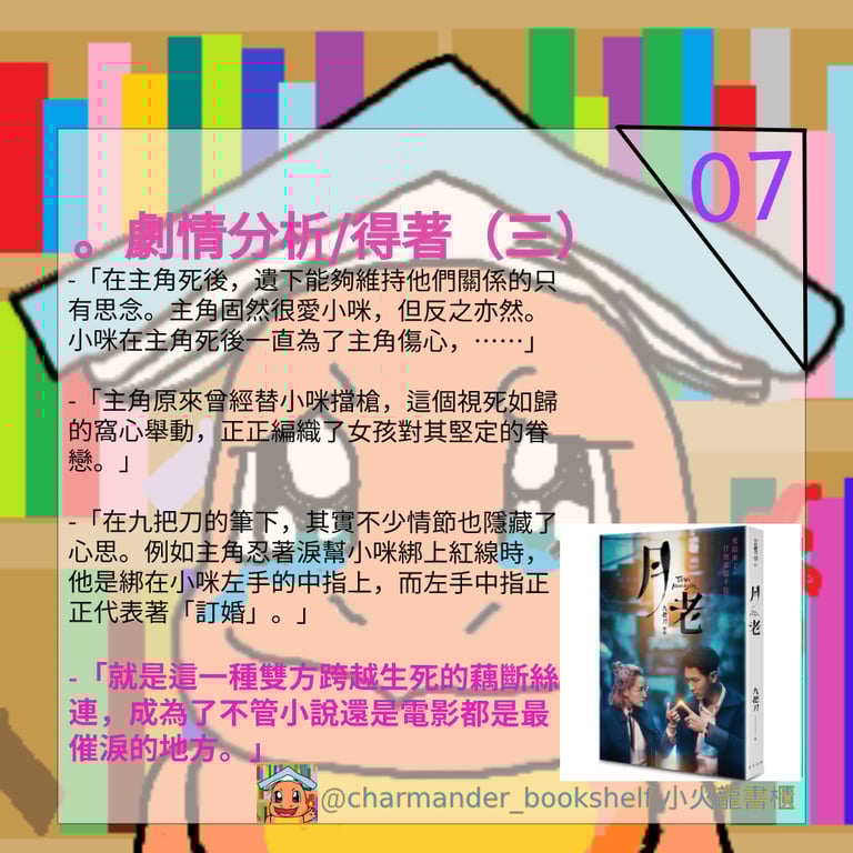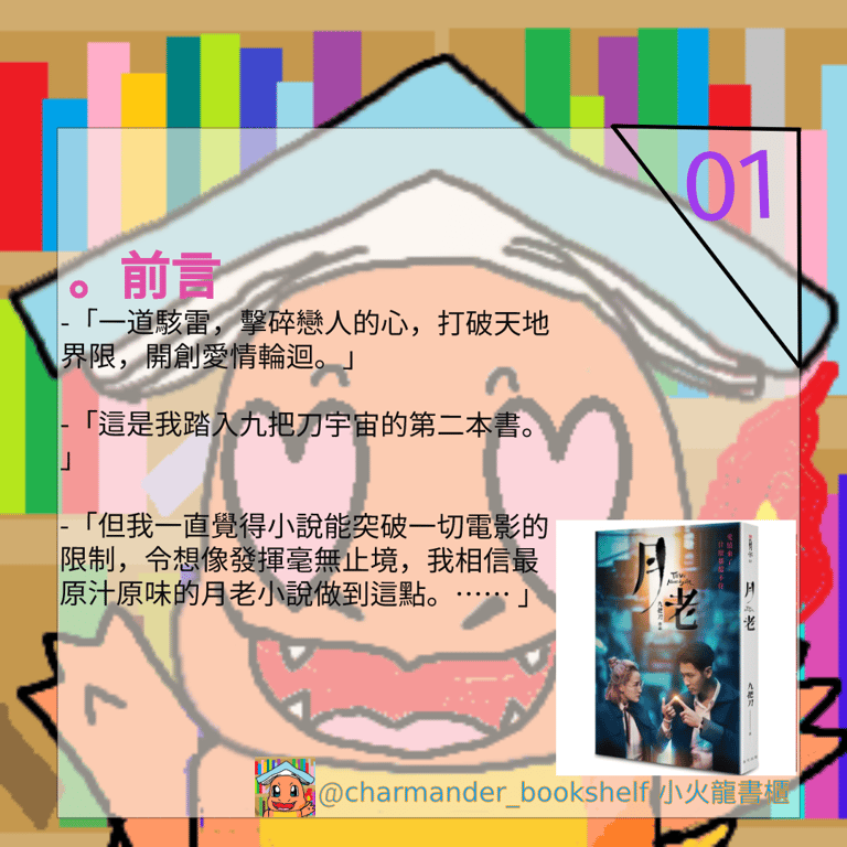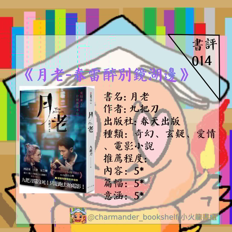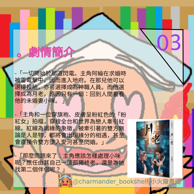 香港人無緣在影院觀看《月老》的電影,最後便折衷在網上平台欣賞;而我呢?因為我沒有帳號,被他們拒諸門外,令我只好和只可看小說。但我一直覺得小說能突破一切電影的限制,令想像發揮毫無止境,我相信最原汁原味的月老小說做到這點。