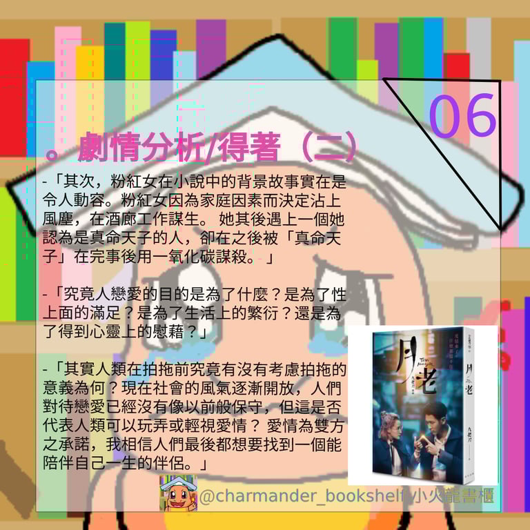 其次,粉紅女在小說中的背景故事實在是令人動容。粉紅女因為家庭因素而決定沾上風塵,在酒廊工作謀生。 她其後遇上一個她認為是真命天子的人,卻在之後被「真命天子」在完事後用一氧化碳謀殺。 究竟人戀愛的目的是為了什麼?是為了性上面的滿足?是為了生活上的繁衍?還是為了得到心靈上的慰藉?粉紅女因為家庭因素而缺失了安全感,戀愛目的就是為了安全感;但他遇上的男人卻是fuckboy,視其為一個滿足自己的對象。我在這裏並不是要鼓勵人人都要進行柏拉圖式的愛,但其實人類(尤其是年輕人)在拍拖前究竟有沒有考慮拍拖的意義為何?現在社會的風氣逐漸開放,人們對待戀愛已經沒有像以前般保守,但這是否代表人類可以玩弄或輕視愛情? 愛情為雙方之承諾,我相信人們最後都想要找到一個能陪伴自己一生的伴侶。