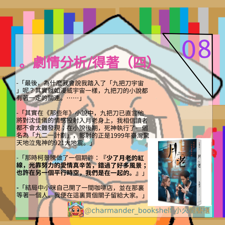 最後,為什麼我會說我踏入了「九把刀宇宙」呢?其實就如漫威宇宙一樣,九把刀的小說都有著一定的關連。其實在《那些年》小說中,九把刀已直言他將對沈佳儀的情感投射入月老身上,我相信讀者都不會太難發現;在小說後期,死神執行了一個名為「九二一計劃」,影射的正是1999年臺灣驚天地泣鬼神的921大地震。在《那些年》故事中,這場地震正正成為了柯景騰和沈佳儀打破隔閡的重要一幕。那時柯景騰做了一個期許:「少了月老的紅線,光靠努力的愛情真辛苦,錯過了好多風景;也許在另一個平行時空,我們是在一起的。」小咪和阿綸、柯景騰和沈佳儀兩條故事線,就在同一個地點、同一個宇宙、同一件事件底下,相交了在一起。結局中小咪自己開了一間咖啡店,並在那裏等著一個人。歡迎大家搜尋女主角之前飾演過的電影清單,我相信大家便會察覺到九把刀的心意,我便在這裏買個關子留給大家。