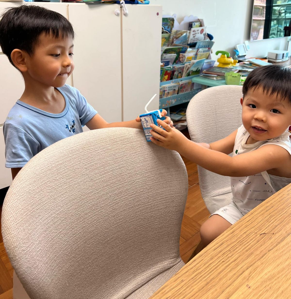 神奇的事情發生了,弟弟的眼睛轉了一轉,好像似懂非懂的把牛奶遞過去給哥哥。