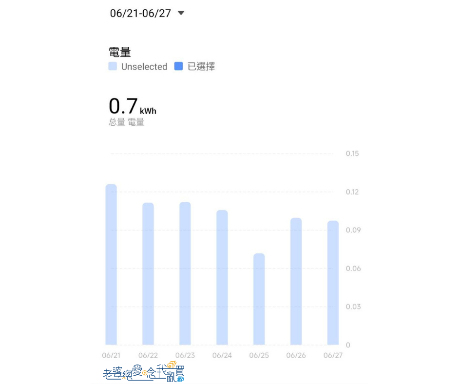 6/21 - 6/27共使用0.7度(KWH),大概3.5元(一度5元)