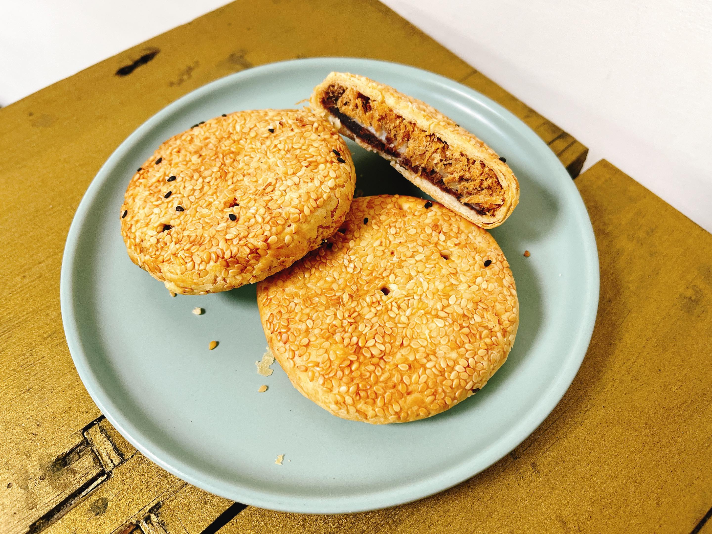 餅皮灑上滿滿的芝麻,素肉鬆的香氣與豆沙餡、麻糬的鹹甜搭配,柔潤順口。
