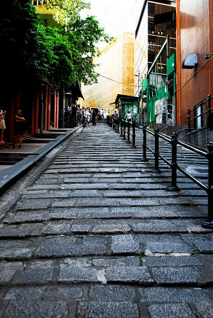 石板街特別之處是石梯,具歷史意義。 或許以前的店都是密密麻麻,都迫在一起,以前人口亦不比現在的多,但為何街上的商店都擠迫在一起,或許舊日的香港生活就是喜歡迫。原因沒有太多紀錄片讓我們深層回憶。