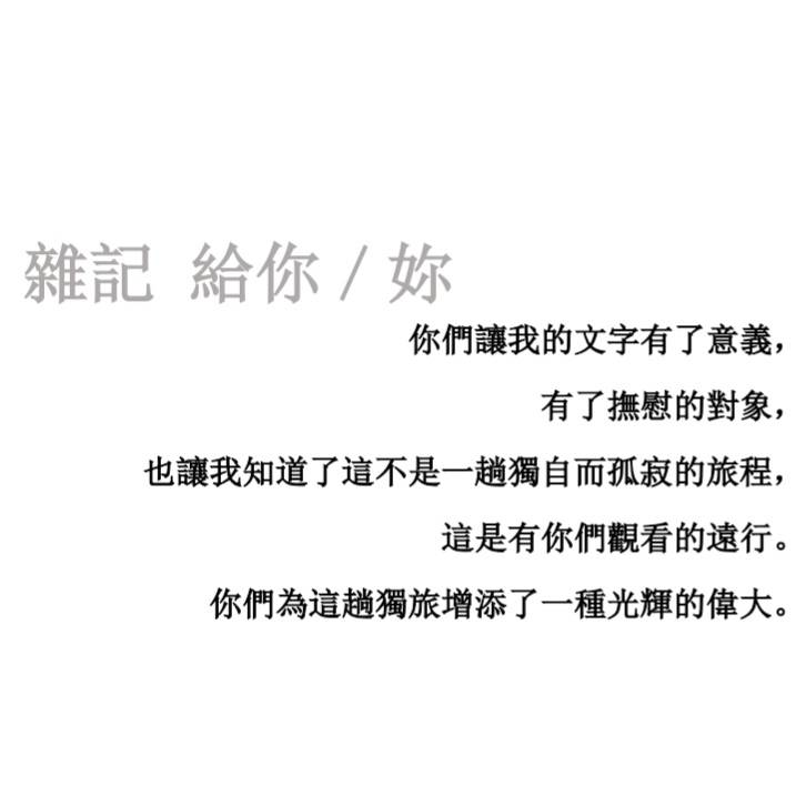 接下來,我得感謝螢幕前的你們。你們讓我的文字有了意義,有了撫慰的對象,也讓我知道了這不是一趟獨自而孤寂的旅程,這是有你們觀看的遠行。你們為這趟獨旅增添了一種光輝的偉大。