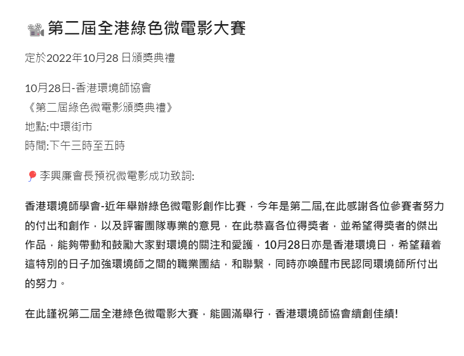 第二屆全港綠色微電影大賽-2022年10月28 日頒獎典禮