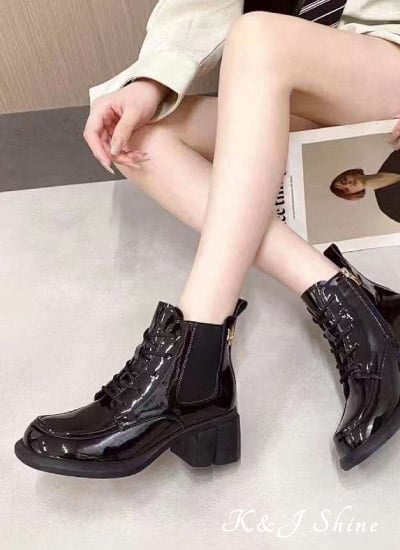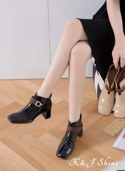 這款歐美風質感方頭靴以亮面設計為亮點,反光鞋面增加了更多稜稜角角的個性,加上帥氣的小皮帶和中間水滴狀鏤空的特殊設計,鞋口的空氣感修飾腳踝線條,提升性感氣質。