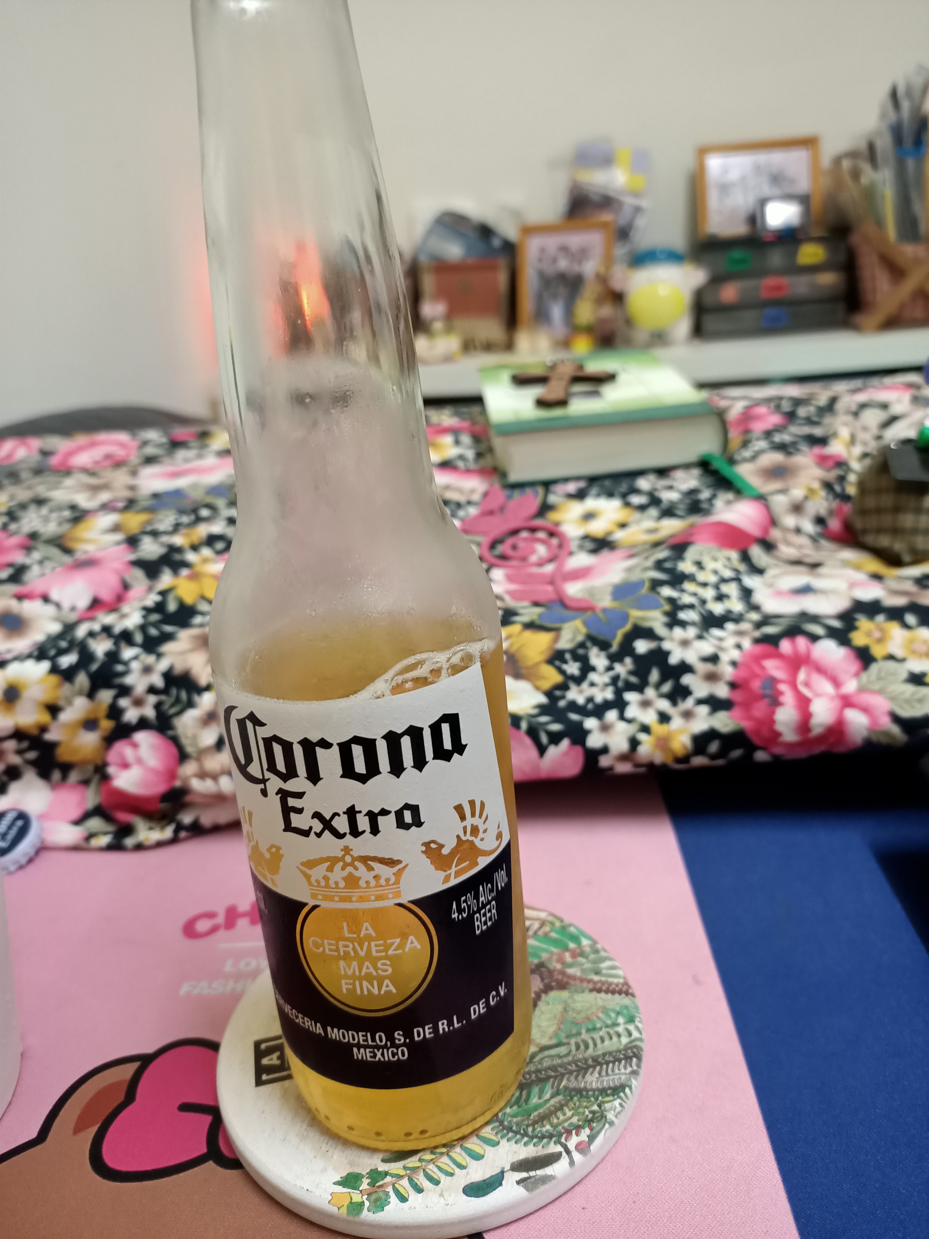 玻璃瓶身,加了少許冰塊,放入2-3天檸檬片,倒在馬克杯裏。就是少了檸檬塞在瓶口,然後用力一拍的快感,泡沫會從瓶口湧出。唉,喝在嘴裏苦得要命,也沒有七喜氣水可以調合。想不到小時後的我們都那麼行啊,這麼苦的酒,還真的都扛拜下肚了,是吧。