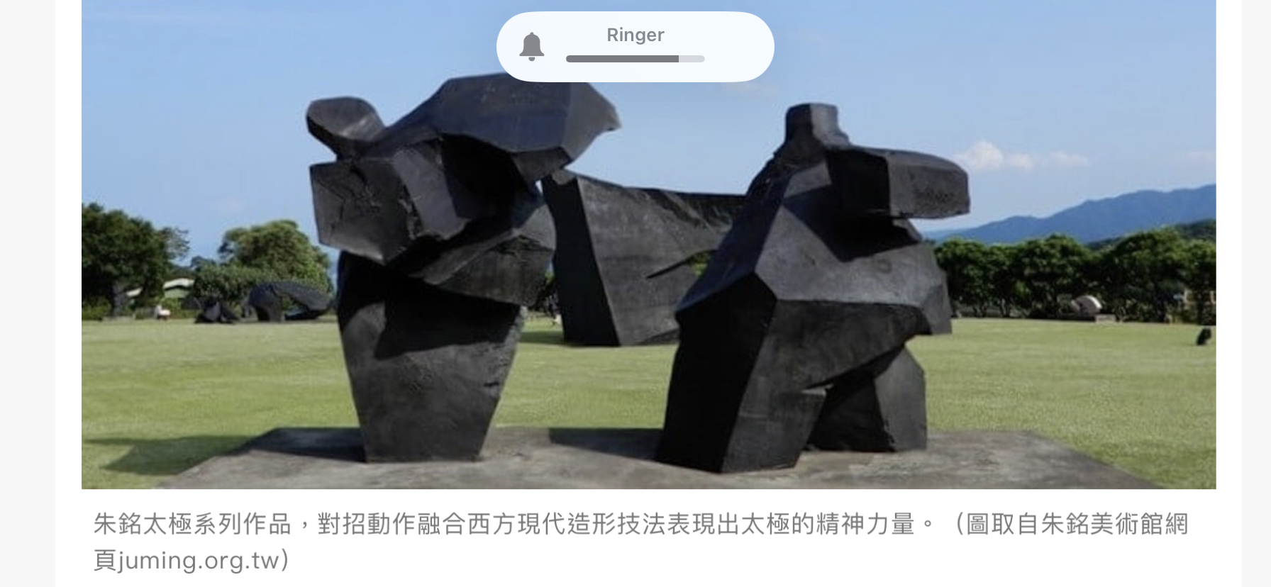 朱銘世界著名作品《太極系列》和《人間系列》, 《太極系列》包括《十字手》《拱門》和《單鞭下勢》,是朱巔峰時期的作品,剛柔並濟,將中國文化陰陽五行融入於西方的雕刻藝術裏面,歐美的藝術愛好者非常欣賞接受,因而聲名鵲起!《人間系列》包括《三軍》《降落傘》《科學家》《紳士》和 《囚》;作品表現小人物日常生活,非常有現實感。有興趣的朋友可以上網查找相關資料,親身體驗一下佢的藝術魅力。這些作品曾經於2014年在香港藝術館展出,當年我也適逢其會,被他的藝術感染記憶猶新!