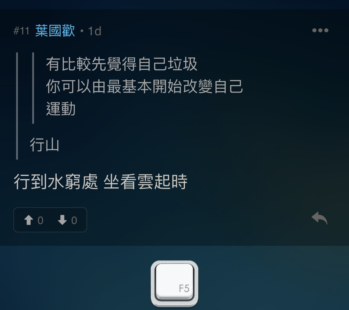 行到水窮處 坐看雲起時我打這篇文 有主耶穌加持人生難免失意之時但可能蘊藏主的美意係行山之前感受到連登暖流誰人又相信我居然隔天會行山希望有葉繼歡嘅勇氣同埋有葉國歡嘅樂觀完美時間 希望永遠行在神裏因為神有完美時間葉國歡呢個名真係好搞笑高級幽默 現實中應該會做到朋友我啊 很想念在日本的產業我的鳥貴族 一般般連鎖快餐店