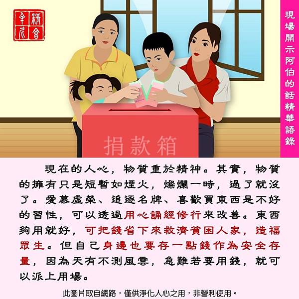 24.佈施是很高尚的事,以歡喜心來佈施,除了將自心的慳貪去除、提升了自己之外,也能讓受苦眾生久旱逢甘霖,在苦難中得到希望,能繼續走下去。