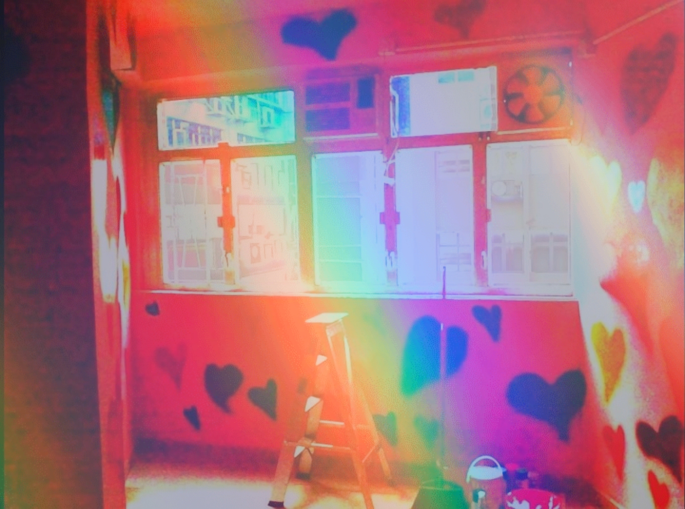本來殘骸般的牆身,在朋友們的幫助下,被途上了士多啤梨奶昔作底漆!再以一夜一晝之生命值把不同顏色的心形噴上……