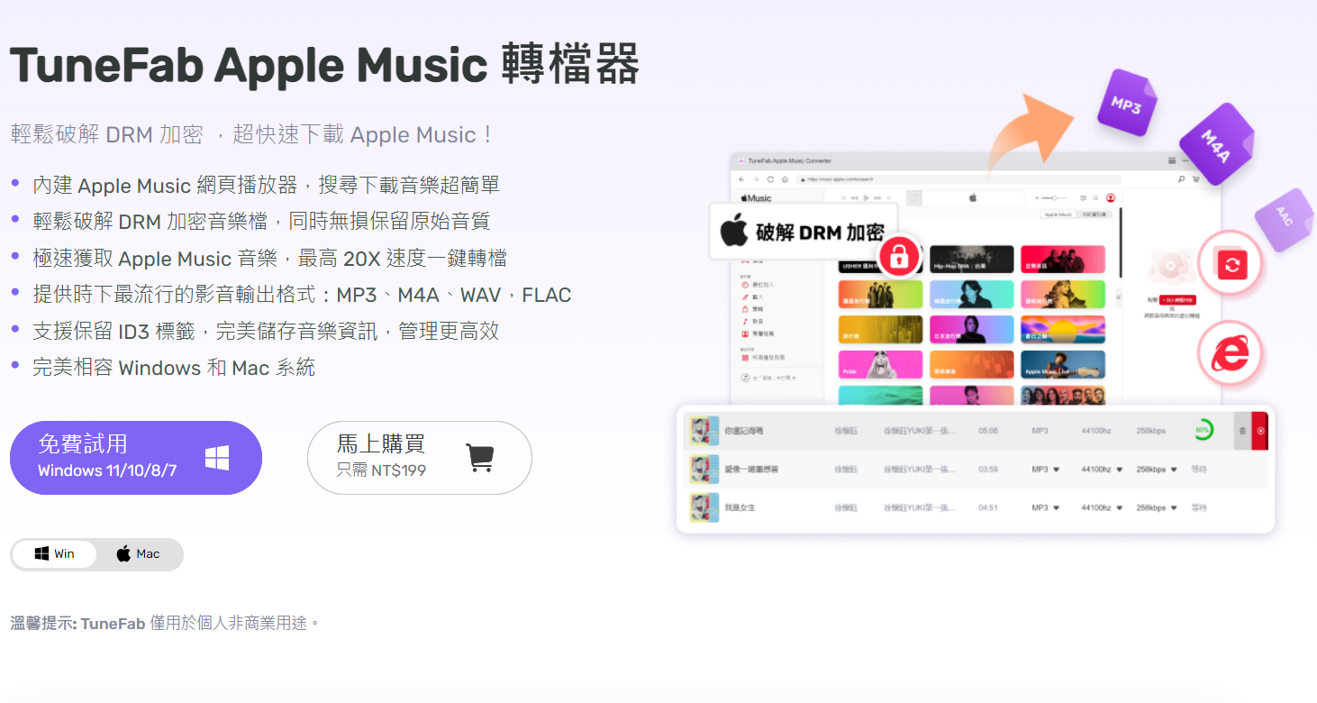 全新改版後的 TuneFab Apple Music 轉檔器使用起來更加直觀方便,為用戶提供了更好的使用體驗。新版本的 TuneFab Apple Music 轉檔器依舊提供免費的試用版,擁有 30 天的試用期,試用期間只支援轉換歌曲的前 3 分鐘。若需要訂閱現時月費版及終身版各有 7 折和 6 折的優惠,詳情可訪問官網查看 https://www.tunefab.tw/store/buy-apple-music-converter-mac.html 。