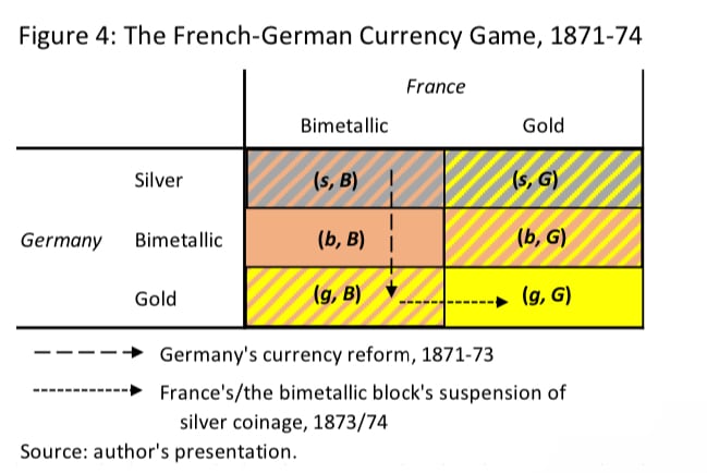 普法戰爭後,德國若采用銀本位或復本位,法國可通過轉向金本位來報負德國經濟,因而金本位為此時的可用選擇。德國在復本位與金本位中抉擇時,法國若沿用復本位則無區別。假如雙方共同轉向金本位,黃金的驟然短缺將同時沖擊歐美各國。倘若戰爭並未發生,德國的貨幣改革取決於法國是否對更高比例的白銀流通關心,若不關心則德國盡可以去選擇金本位或法國式的復本位,如同之前英國的選擇。若法國介意,尚可選擇復本位以對接法國的拉丁貨幣同盟。50年代中期起澳美金礦的枯竭與70年代美國西部井噴的銀礦開采將全面扭轉過去十余年法美兩國攀升的金幣佔比,讓Soetbeer等德國金本位派不切實際的擔心徹底打消。