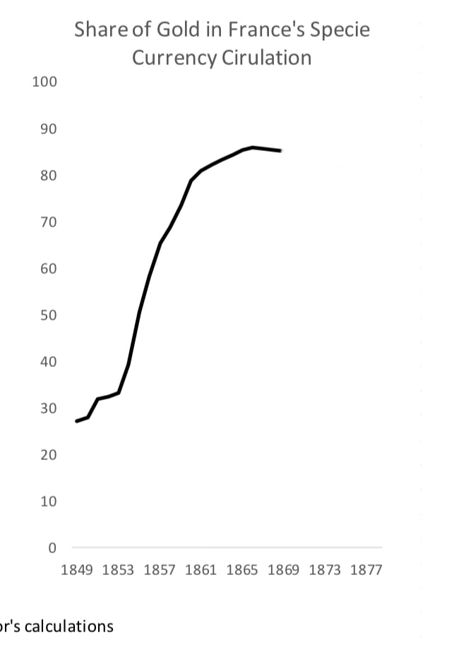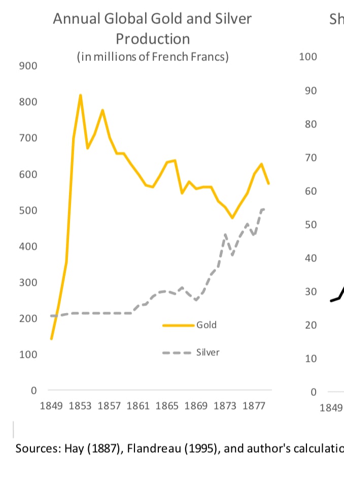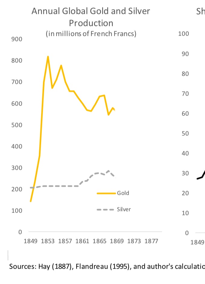 由於對清貿易白銀逆差與18 世紀的巴西淘金熱,英國和葡萄牙是1860年以前為數不多的金本位制國家;1849 年的加州與1851 年的澳洲淘金熱,漸漸推高法美兩個復本位制大國流通貨幣中金幣的佔比。