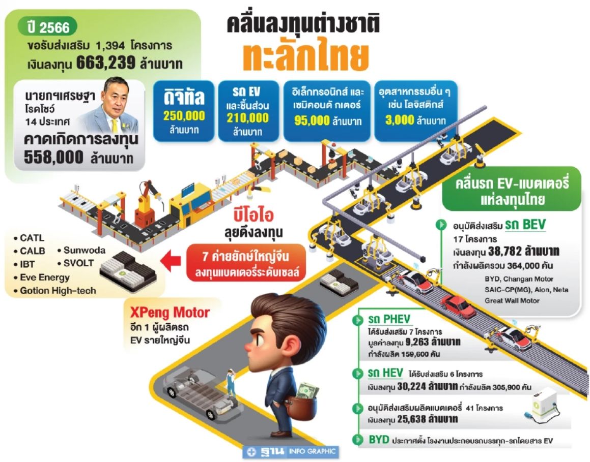 泰國投資促進委員會表示,總理兼財政部長賽塔過去6個月對14個國家進行路演訪問,預計未來發生的投資總額將超過5580億銖,其中有約2100億銖將發生在電動車(EV)及零件產業上。在民會質詢辯論中,賽塔總理強調希望大家耐心等待,未來兩年將看到大量投資湧入泰國,稱為「投資海嘯」。