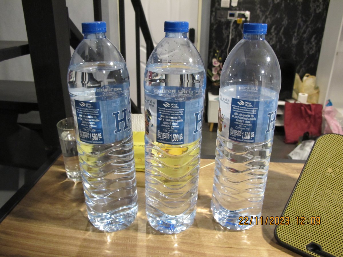 在便利店和超市都有飲用水出售,對比香港便宜。我沒有瓶子,所以第二天便先去買了6支1500毫升的,才40多銖,十來元港幣,每瓶才幾港元!剩下的瓶子便留下來買水。