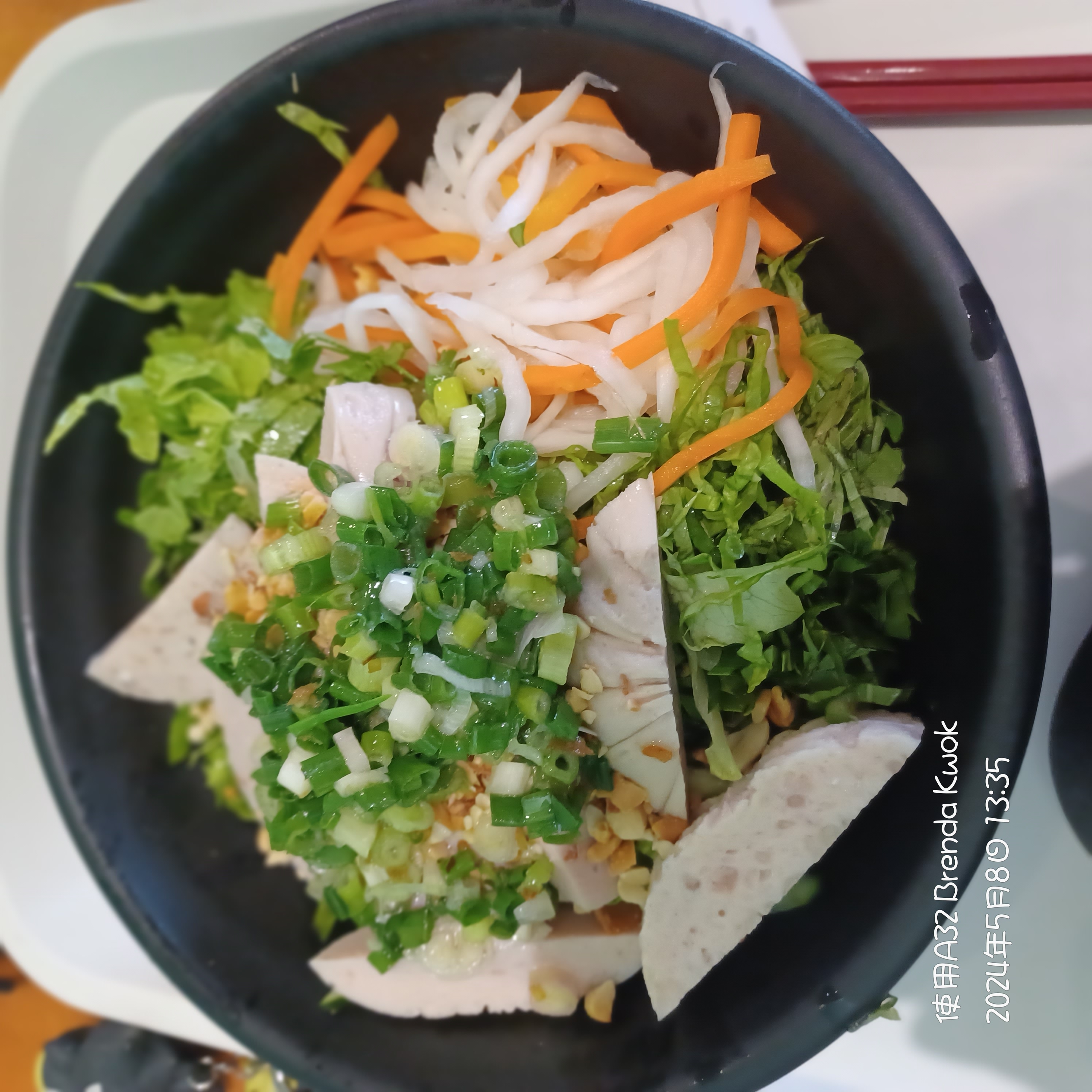 材料有扎肉,羅勒葉,生菜絲,芽菜,花生碎, 青瓜絲,加上調味醋放在碗底一起撈,味道好fresh, 好開胃?