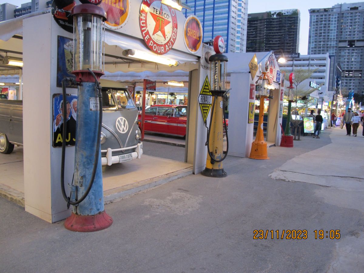 這個夜市也是走火車風格,所以跟席娜卡琳火車夜市一樣,有汽車擺放作裝飾,也有弄成加油站的柱子裝潢。