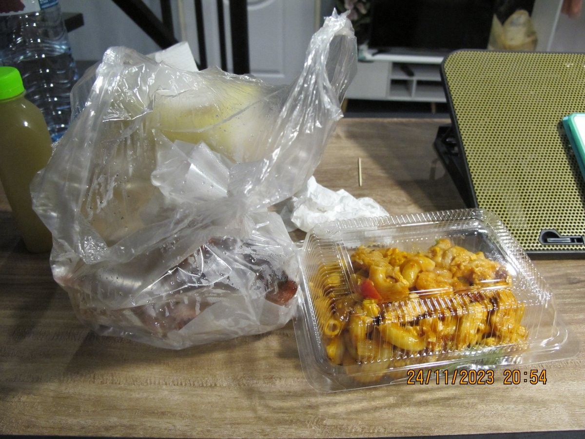 這晚就是炸雞腿配炒通心麵,加上蔗汁。