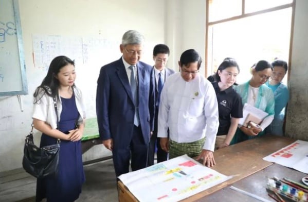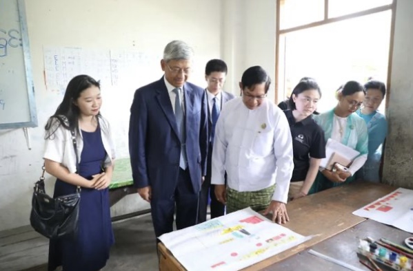 學生代表發言感謝中方捐贈,表示捐贈物品有助於其更好學習生活,將努力學習,傳承緬中友好。陳海大使和梭登首席部長也共同參觀學校,觀看學生們使用捐贈文具創作的中緬友善繪畫作品。(緬華網授權)